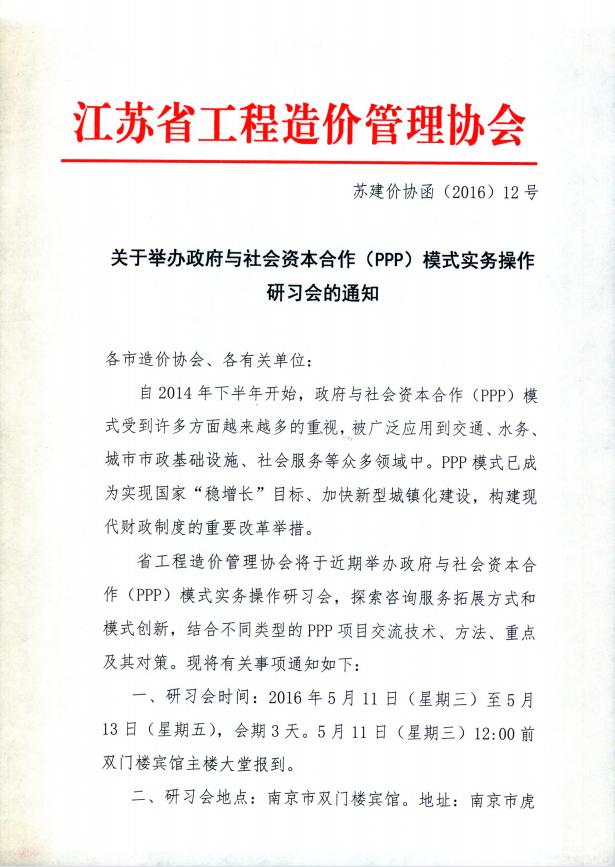 轉發(fā)省造價(jià)協(xié)會(huì )關(guān)于舉辦政府與社會(huì )資本合作(PPP)模式實(shí)務(wù)操作研習會(huì )的通知